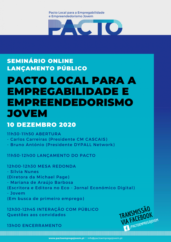 No passado dia 10 de dezembro 2020, aconteceu o Lançamento Público do Pacto Local para a Empregabilidade e Empreendedorismo Jovem, reunindo num seminário online o Presidente da Câmara de Cascais Carlos Carreiras e o diretor executivo da DYPALL Network, Bruno António.