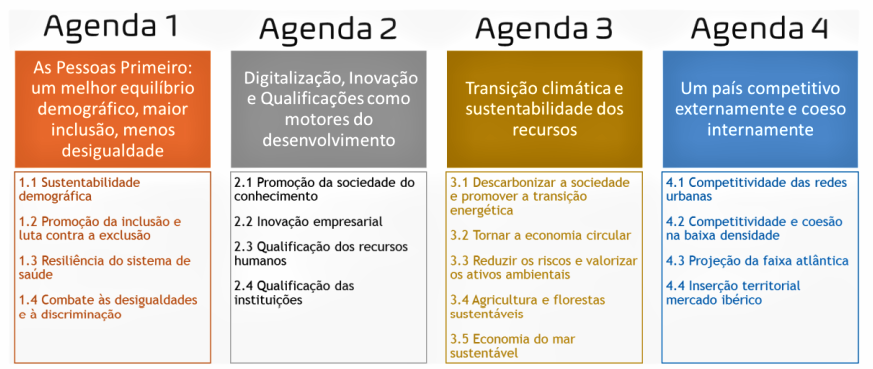 Foram delineadas quatro agendas temáticas centrais para o desenvolvimento da economia, da sociedade e do território de Portugal: