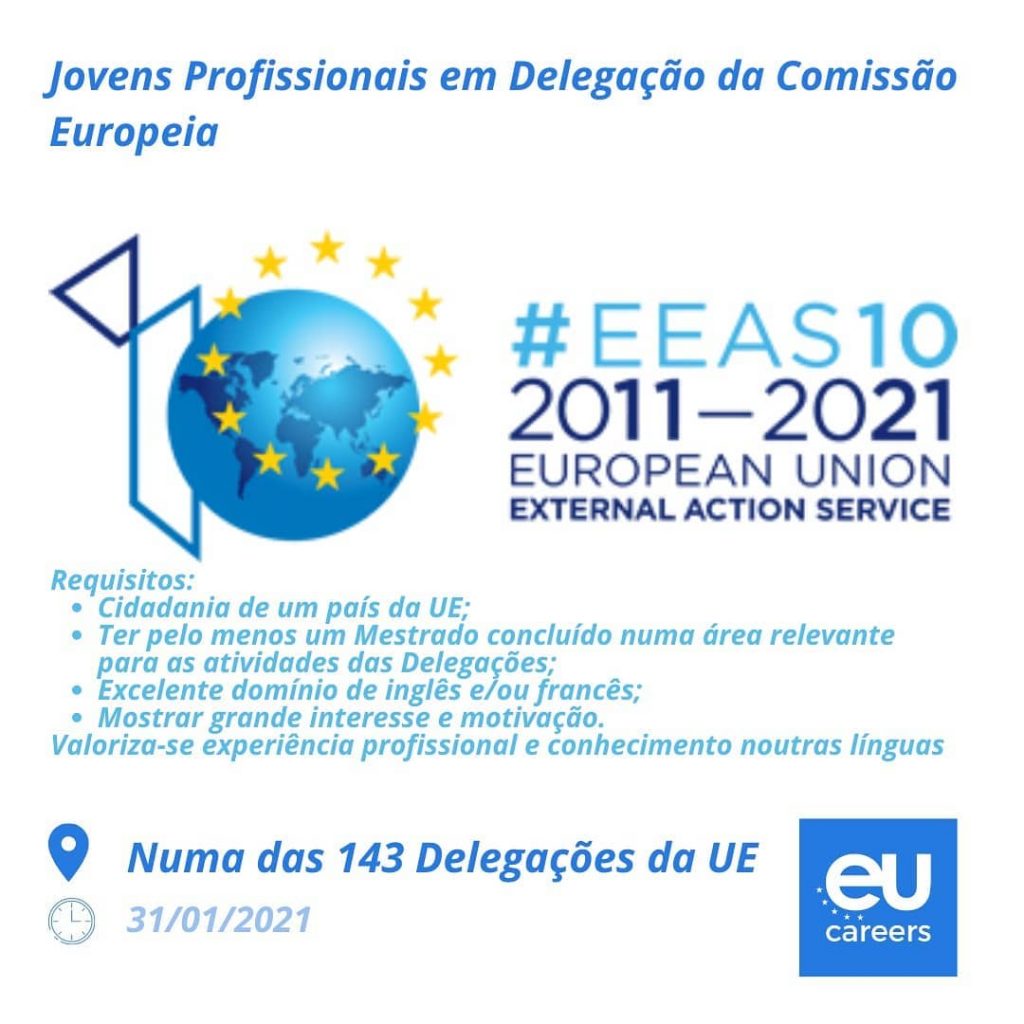 O programa de Junior Professionals (Jovens Profissionais em Delegação JPD) oferece a oportunidade a cidadãos de um Estado-Membro da UE de fazer um estágio pago numa das 143 Delegações da UE pelo mundo. O Serviço Europeu para a Ação Externa (SEAE) e a Comissão Europeia (CE) criaram este programa de estágio de alto nível, que oferece a jovens profissionais qualificados a oportunidade de ganhar experiência no trabalho das Delegações e sólido conhecimento do seu papel na implementação das políticas externas da UE.
