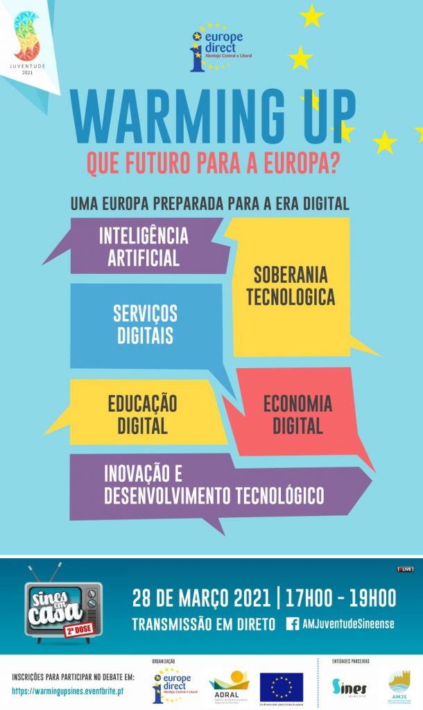 O Centro Europe Direct Alentejo Central e Litoral, com o apoio da CM de Sines e da Associação + para a juventude Sineense, realiza um evento online Warming Up – Que futuro para a Europa? destinado à comunidade jovem e cujo tema desta sessão é: “A Era Digital na União Europeia.”.