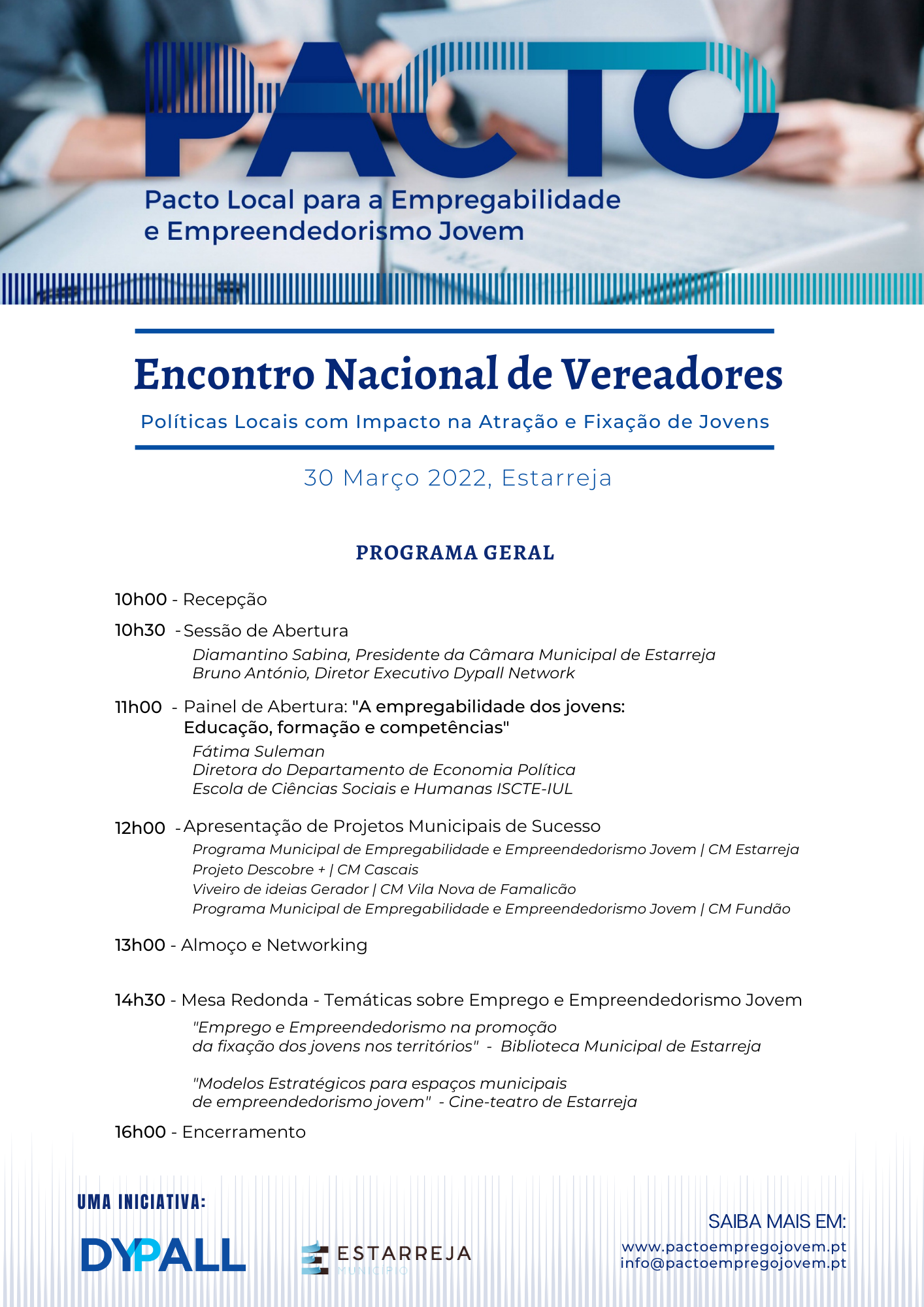 No âmbito da iniciativa PACTO Local para a Empregabilidade e Empreendedorismo Jovem, foi organizado um Encontro Nacional de Vereadores, em Estarreja, no dia 30 de Março de 2022.