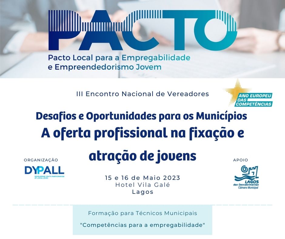 No âmbito da iniciativa PACTO Local para a Empregabilidade e Empreendedorismo Jovem, organiza-se um III Encontro Nacional de Vereadores, em Lagos, no dia 15 e 16 de Maio de 2023.