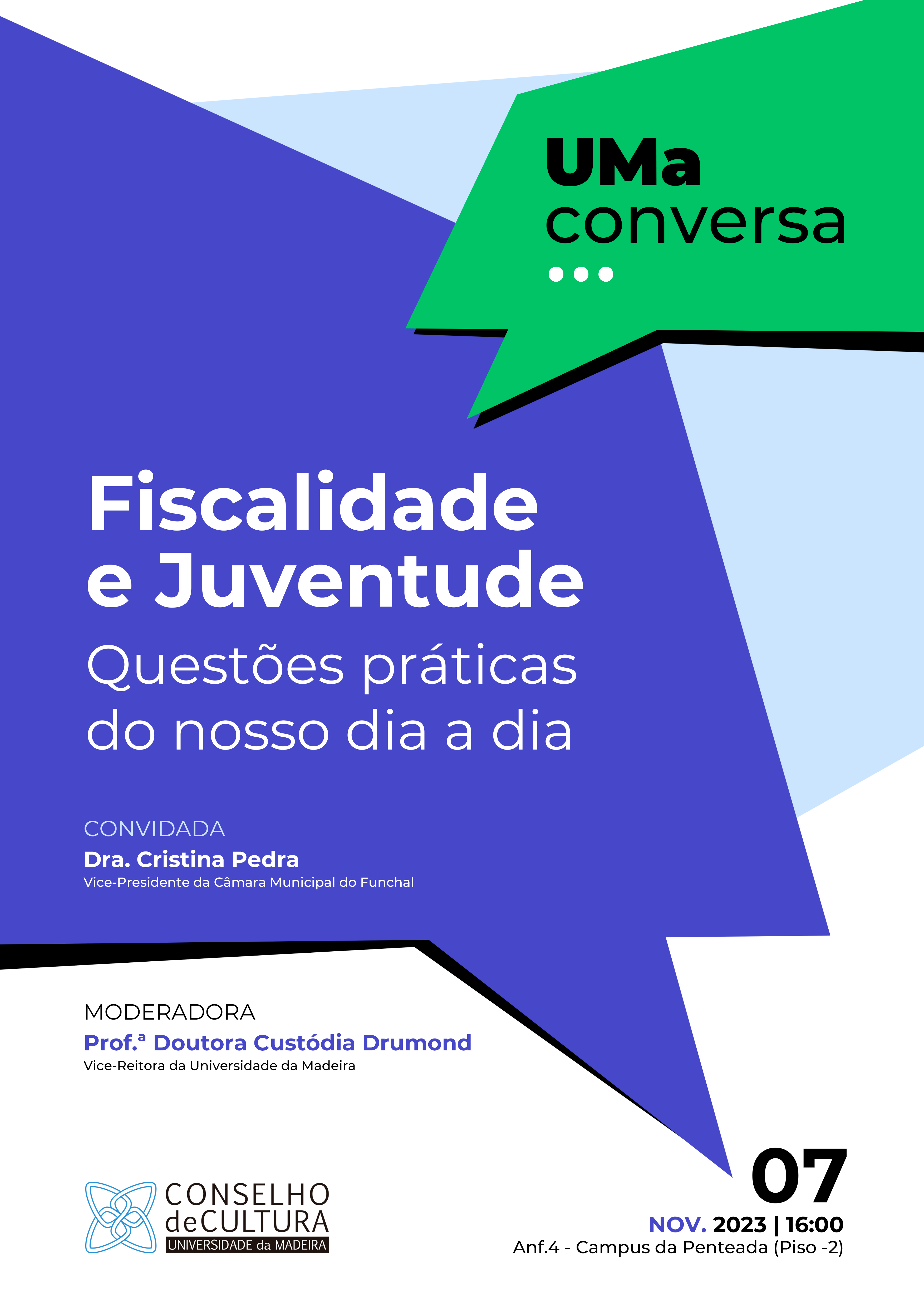 No âmbito da sua programação para o ano letivo de 2023/2024, o Conselho de Cultura da Universidade da Madeira criou um evento, a decorrer mensalmente, intitulado “UMa conversa…”, destinado aos estudantes e aos demais interessados da Academia, que tem como objetivo conversar sobre temáticas variadas. A conversa dedicada ao tema “Fiscalidade e Juventude – Questões práticas do nosso dia a dia“, contou com a participação da Dra. Cristina Pedra, Vice-Presidente da Câmara Municipal do Funchal.