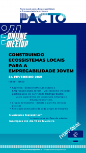 Tivemos a participação especial do Dr. Rodrigo de Melo e Castro. Os Meet Up são atividades online previstas no âmbito deste projeto, onde técnicos municipais podem discutir temas relacionados com a Empregabilidade e Empreendedorismo Jovem, assim como estabelecer contactos para networking e conhecer boas práticas de outros municípios parceiros. Atividade… Leia mais: 1º Meet Up 24.02.2021 «Construindo Ecossistemas Locais para a Empregabilidade Jovem» - Lançamento Público – Pacto Local para a Empregabilidade e Empreendedorismo Jovem – 10 de Dezembro 2020
