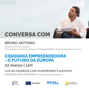 Uma conversa com Bruno António, Diretor da DYPALL Network e Coordenador do Pacto Local para a Empregabilidade e Empreendedorismo Jovem. Cidadania Empreendedora – O Futuro da Europa Queremos europeus ativos, participativos, opinativos!E queremos europeus que queiram discutir ideias sobre como podem desenvolver as suas competências de cidadania, empreendedorismo ou procura… Leia mais: Live Facebook EuropeDirect Alto Alentejo: Cidadania Empreendedora – O Futuro da Europa 22 Março 2021 - 1º Meet Up 24.02.2021 «Construindo Ecossistemas Locais para a Empregabilidade Jovem»