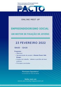 Tivemos a participação especial do Dr. Carlos Sousa Santos – Gestor de Resiliência da Human Power Hub – Centro de Inovação Social de Braga. Os Meet Up são atividades online previstas no âmbito deste projeto, onde técnicos municipais podem discutir temas relacionados com a Empregabilidade e Empreendedorismo Jovem, assim como… Leia mais: Meet Up 23.02.2022 «Empreendedorimo Social – um Motor de Fixação de Jovens» - Campanha de atualização de dados – Autárquicas 2021