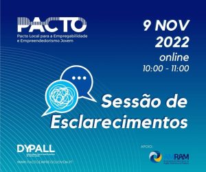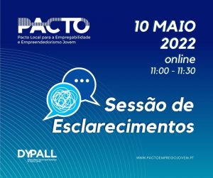 Sessão de esclarecimentos online sobre o Pacto Local para a Empregabilidade e Empreendedorismo Jovem Programa:Apresentação do Pacto Local para a Empregabilidade e Empreendedorismo JovemPlano de Atividades 2022Como se pode envolver o município – questões e esclarecimentos - Encontro Nacional de Vereadores – 30 de março 2022
