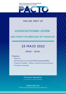 Tivemos a participação especial da Câmara Municipal da Maia, que apresentou o projeto Fórum Jovem da Maia. Os Meet Up são atividades online previstas no âmbito deste projeto, onde técnicos municipais podem discutir temas relacionados com a Empregabilidade e Empreendedorismo Jovem, assim como estabelecer contactos para networking e conhecer boas… Leia mais: Meet Up 25.05.2022 «Associativismo Jovem – Uma Ponte ao Mercado de Trabalho» - Sessão de Esclarecimentos online – 10 de maio 2022