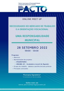 Sessão de esclarecimentos online sobre o Pacto Local para a Empregabilidade e Empreendedorismo Jovem aos Municípios da Região Autónoma da Madeira. Venha saber mais, neste evento apoiado pela AMRAM – Associação de Municípios da Região Autónoma da Madeira. Programa:Apresentação do Pacto Local para a Empregabilidade e Empreendedorismo JovemComo se pode… Leia mais: Sessão de Esclarecimentos online – 09 de novembro 2022 - Meet Up 28.09.2022 «Necessidades do Mercado de Trabalho e a Orientação Vocacional – uma responsabilidade municipal»