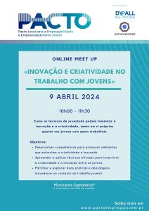 O Pacto Local para a Empregabilidade e Empreendedorismo Jovem é uma iniciativa de networking entre municípios comprometidos em oferecer aos seus jovens mais e melhores oportunidades para o seu futuro, criando condições para o seu desenvolvimento pessoal, social e profissional. Em 2024, a DYPALL Network, enquanto entidade coordenadora do PACTO, organiza… Leia mais: Webinar 18.06.2024 «Competências Digitais para os Profissionais de Juventude» - Meet Up 09.04.2024 «Inovação e Criatividade no Trabalho com Jovens»